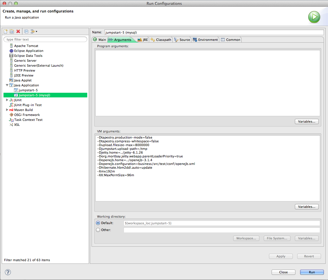 - Choose your existing configuration, eg. Java Application > jumpstart.
