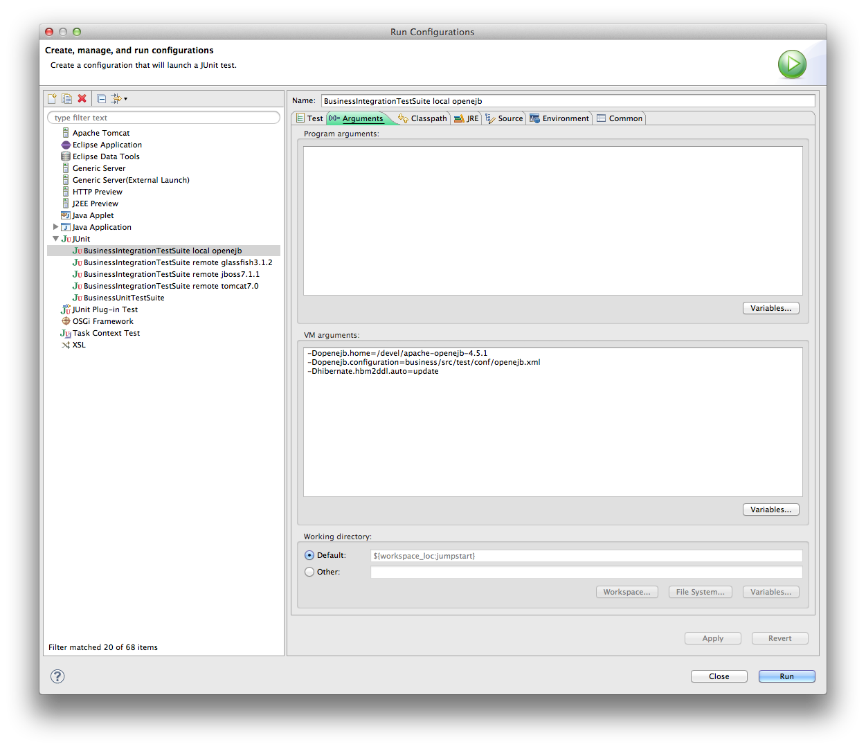 The embedded OpenEJB server will use an in-memory HSQLDB database. The significance of in-memory is that it will start empty and be discarded afterwards. We specify the database in business/src/test/conf/openejb.xml, and we will set system property openejb.configuration to that file.
