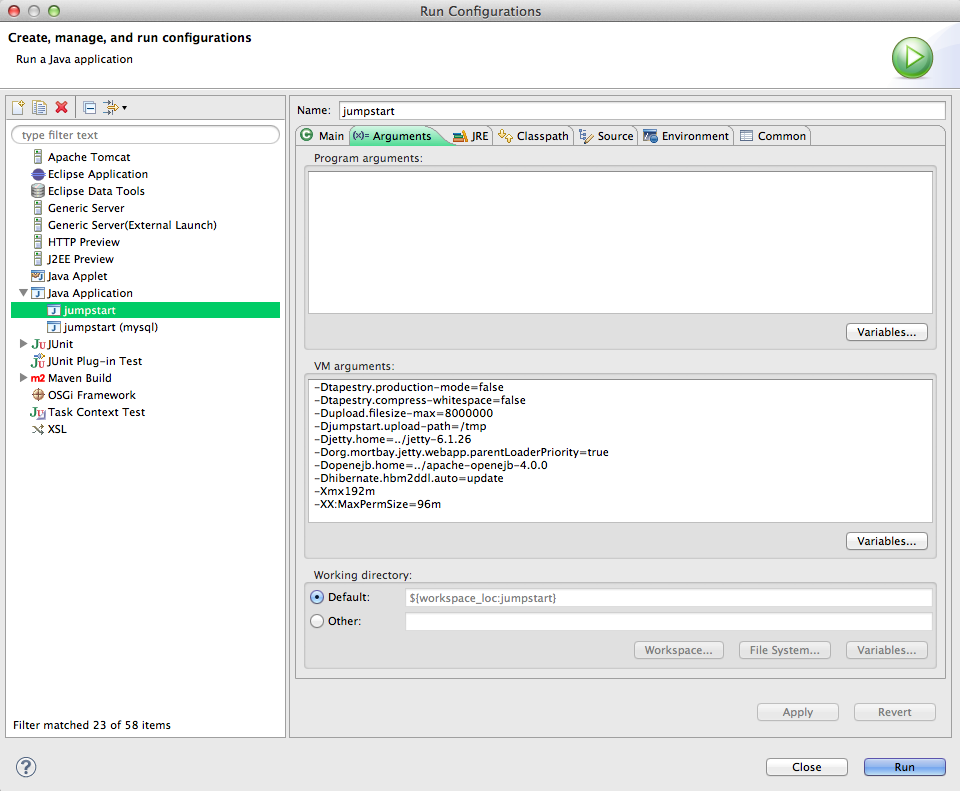 - Set the VM arguments to the following, replacing the value of openejb.home with yours, eg.: