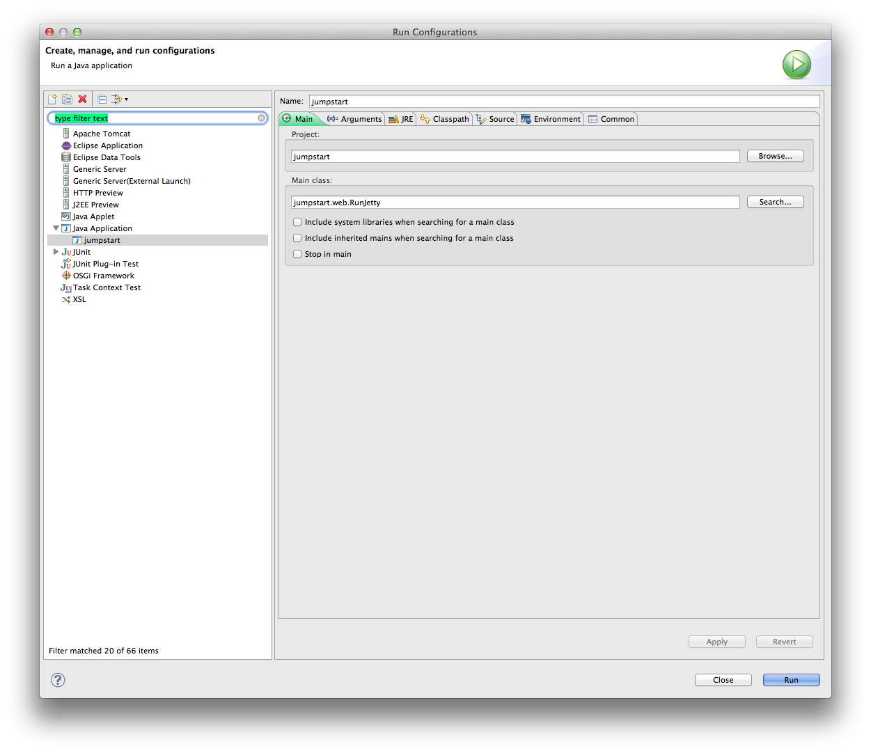 ClassNotFoundExceptionfororg.slf4j.Loggerororg.slf4j.impl.StaticLoggerBinder, check the Arguments and classpath match those shown above. - Check JumpStart is running by pointing your web browser at http://localhost:8080/jumpstart.